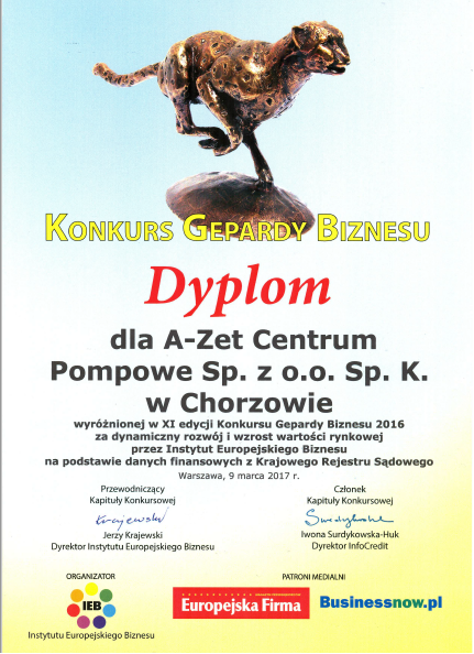 Firma A-ZET Centrum Pompowe Sp. z o.o. Sp. Komandytowa uhonorowana została za rok 2016 prestiżową nagrodą przyznawaną najszybciej rozwijającym się firmom w Polsce. Przedsiębiorstwo zostało docenione przez Instytut Nowoczesnego Biznesu oraz...