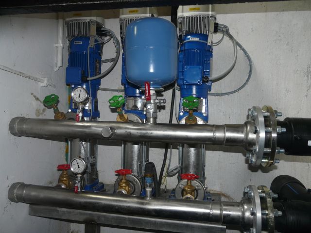 Trzypompowy zestaw hydroforowy zbudowany z pomp wielostopniowych LOWARA z jednostkami sterującymi HYDROVAR.