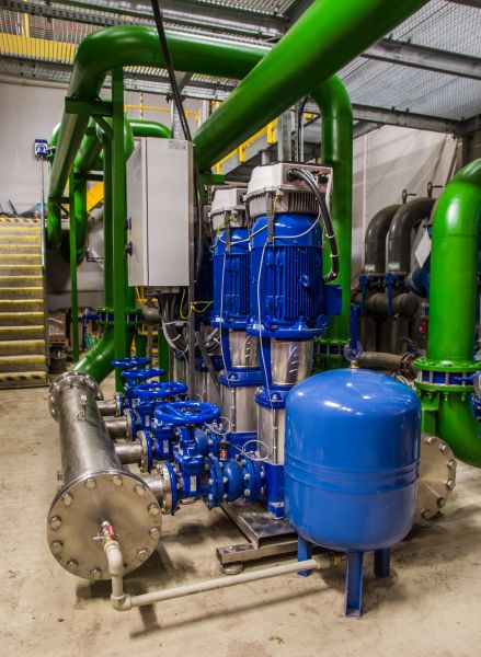 Zestaw 4 pompowy AZH zbudowany z wielostopniowych pomp pionowych zasilający linię technologiczną.