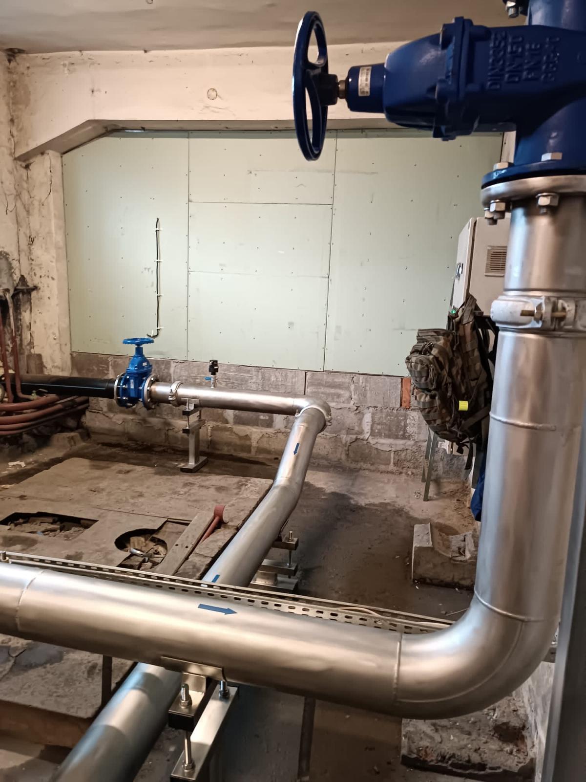 Wymiana zestawu hydroforowego bez sterowania wraz z rurociągami w obrębie pomieszczenia pompowni. Zastosowano złącza Victaulic.